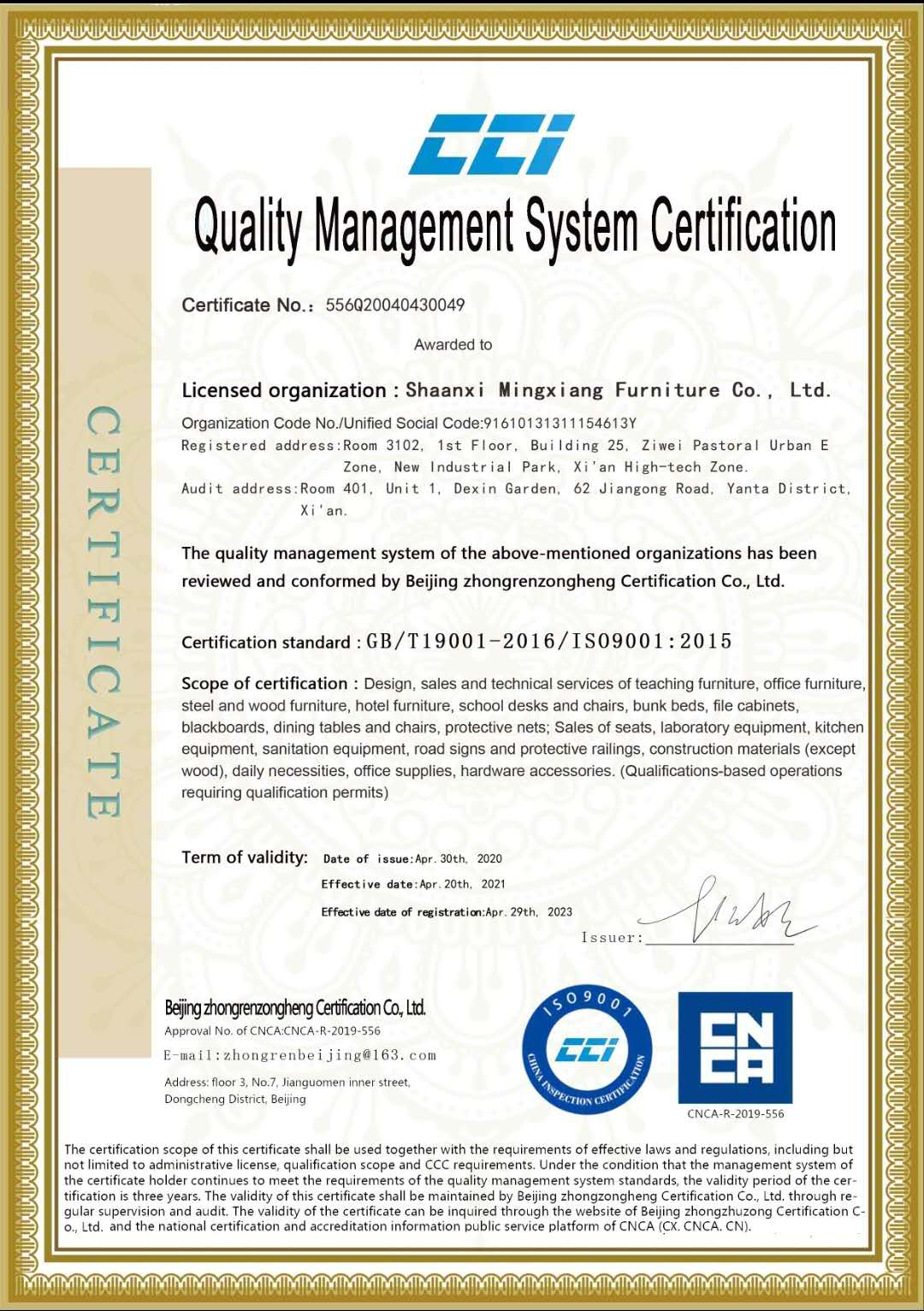 以上就是小编为大家介绍的质量管理体系认证证书的全部内容,如果大家还对相关的内容感兴趣,请持续关注陕西明祥家具有限公司